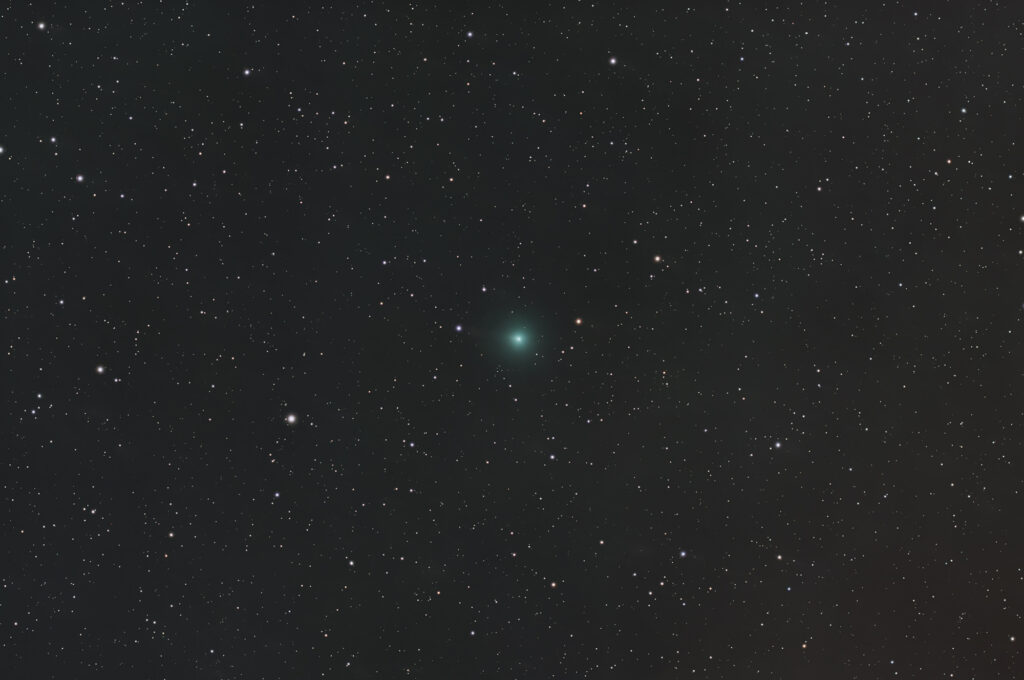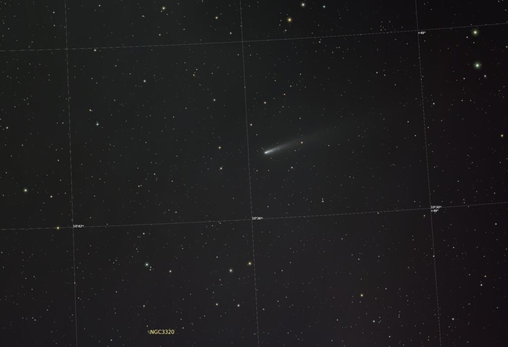 今回はふたご座を通過中を撮影したもので、中央で彗星特有の青白く光っておりぼんやりと右下に向かって尾も見える。