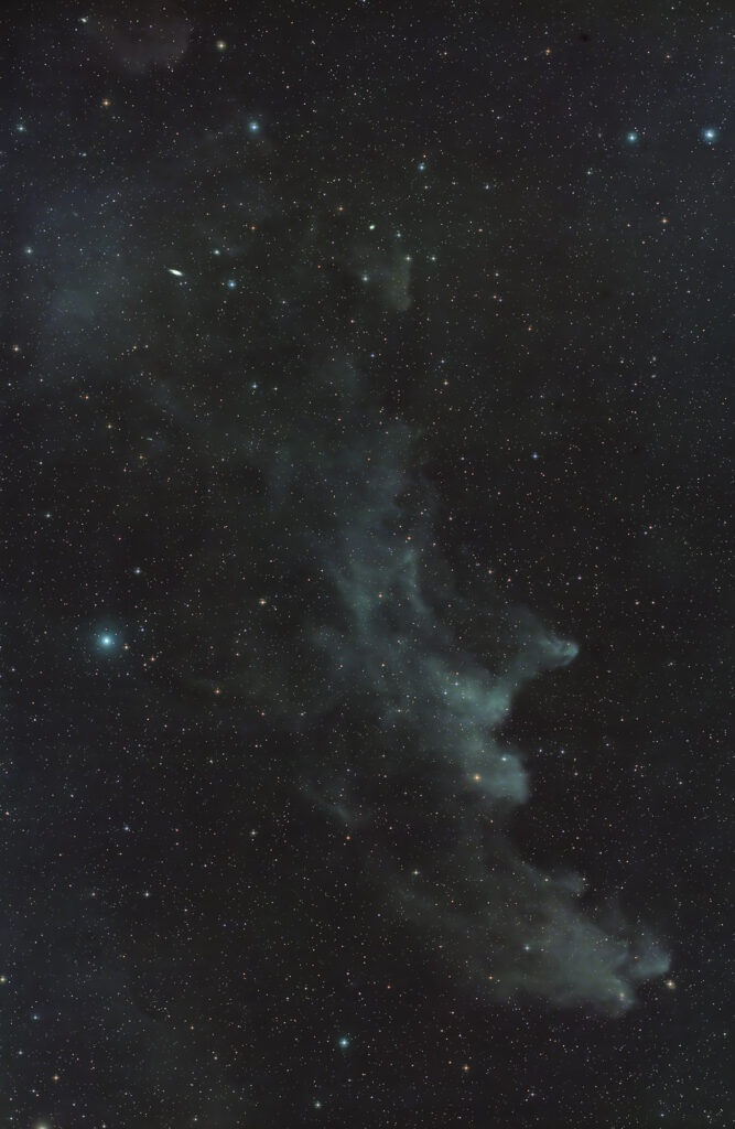 近くにあるオリオン座の青色超巨星 リゲルによって照らされて輝いており、その形状から魔女の横顔星雲 という通称でも知られている。