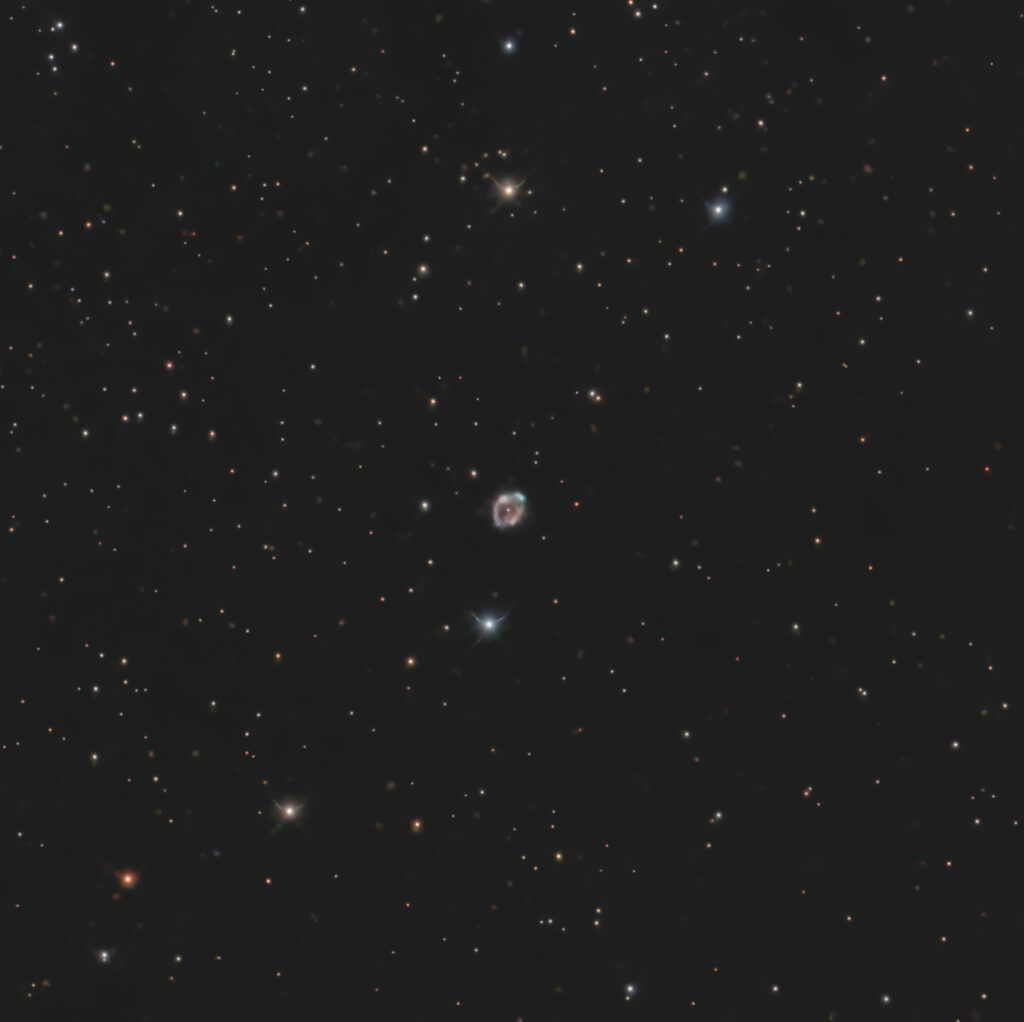 夏のこと座にある有名なM57などの惑星状星雲に比べて距離が遠いため非常にコンパクトに見えるが、色合い的には色んな色が入り交じり美しい。