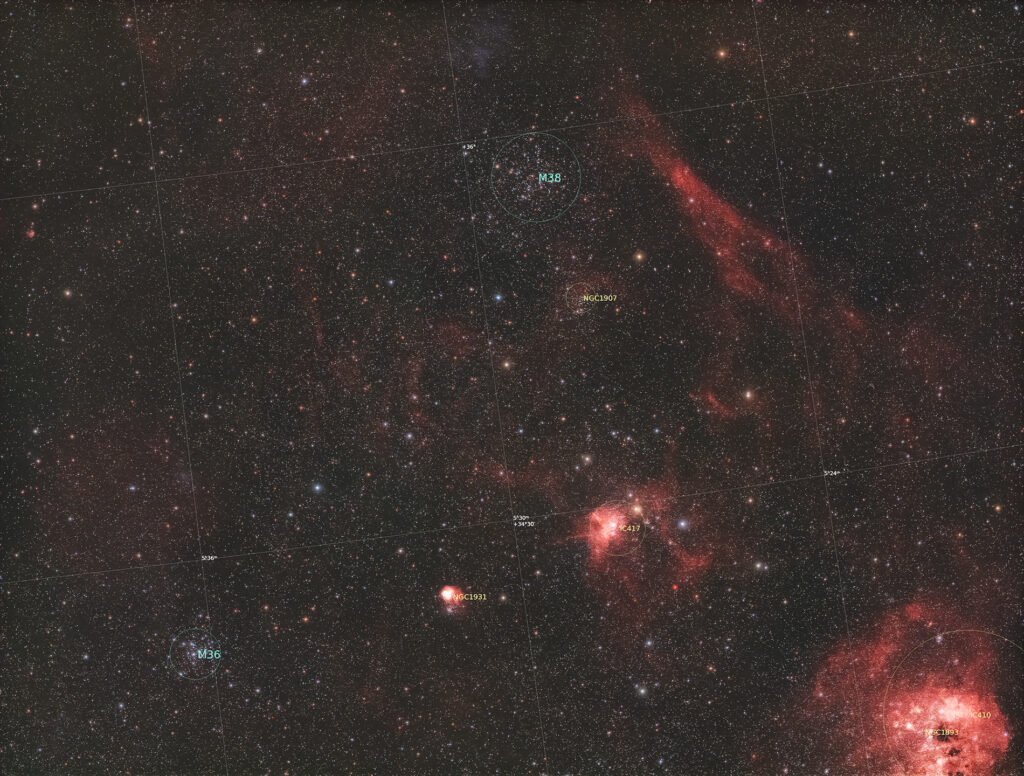 ぎょしゃ座の星雲といえば、IC405やIC410という明るく大きな天体に目がいきがちだが、 IC417のようなマイナーな天体やM36やM38といったM天体を組み合わせて写すのも楽しいものである。