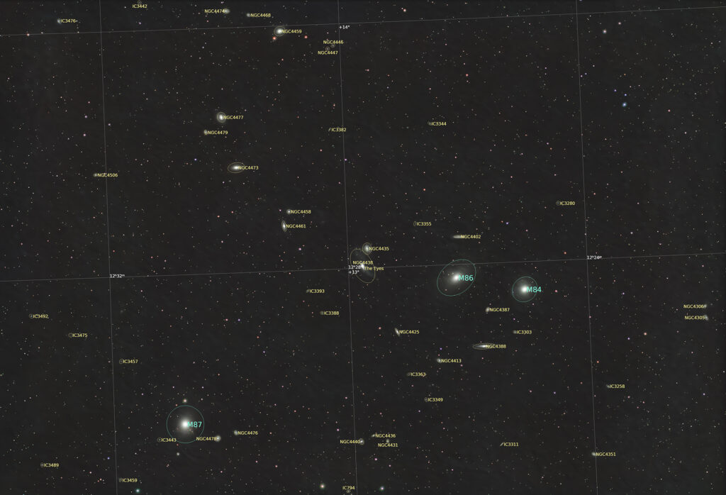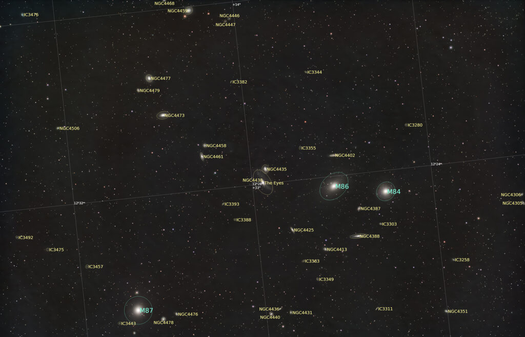 地球から見た場合、各銀河がなめらかな弧を描く曲線状(M84~NGC4477)に乗って見えるので、1960年代に当銀河団に共通する固有運動を発見した旧ソ連の天文学者B・E・マルカリアンにちなんで「マルカリアンの鎖(チェーン)」と命名された。