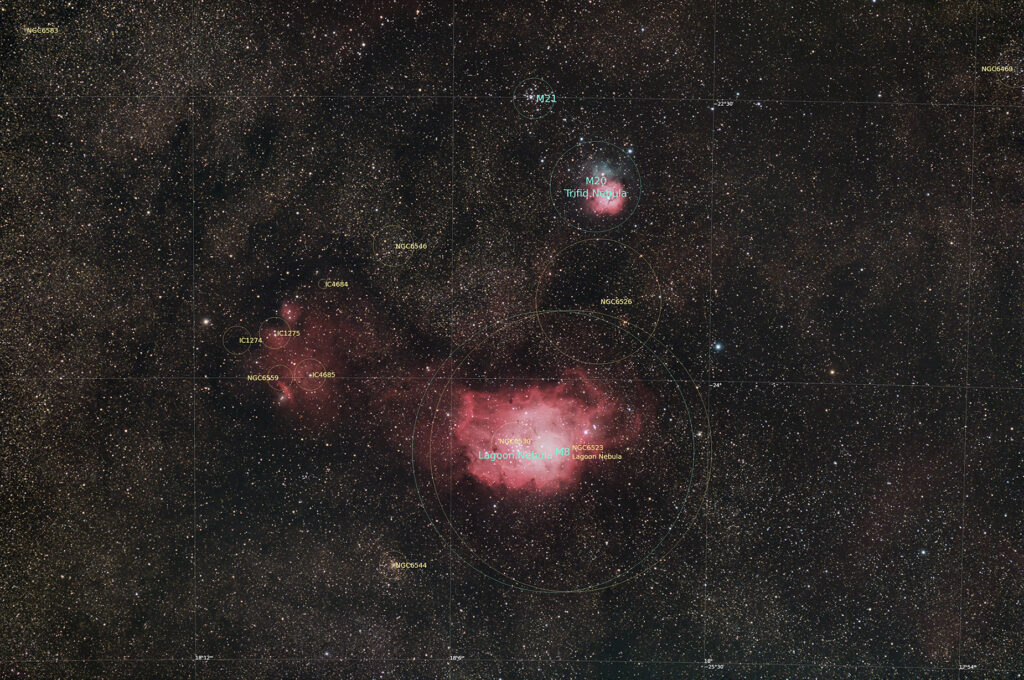 この2つの星雲は1.5°しか離れていないことから広角カメラの対象として有名で、 M20の左側には「猫の手星雲」の愛称で呼ばれるNGC6559等がうっすらと見える。