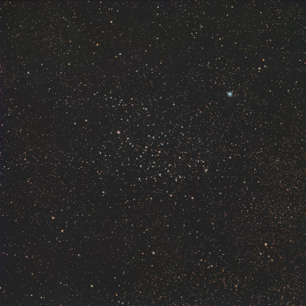 同じような明るさの星がまばらに集まった散開星団で、小型の双眼鏡でも見ることができる。