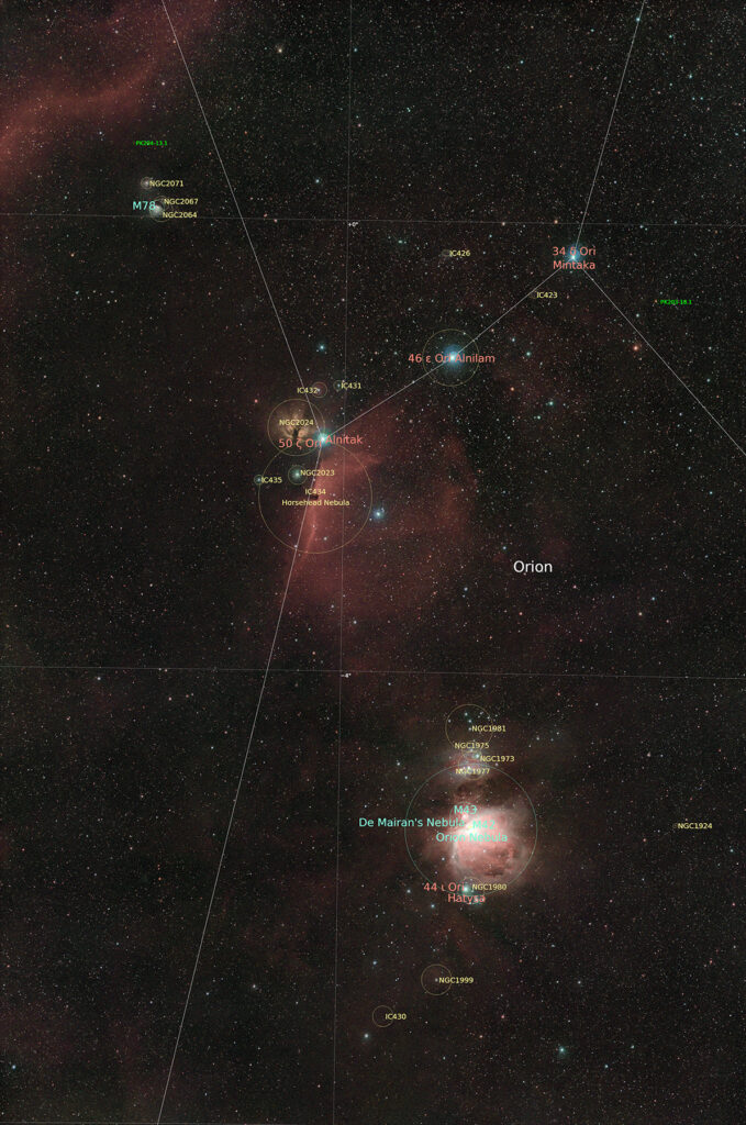 この2星雲以外に、左上にオリオン座を取り囲むように赤く広がるSh2-276(バーナードループ)の一部とその下に白く輝くM78(ウルトラの星)を見ることができ、大変華やかな星域である。