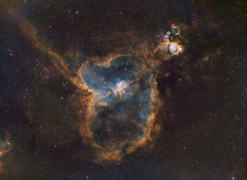 カシオペア座で輝く散光星雲IC1805のナローバンドカラー作品で、 Haフィルター、OIIIフィルター、SIIフィルターを使ったSAOカラー合成写真です。