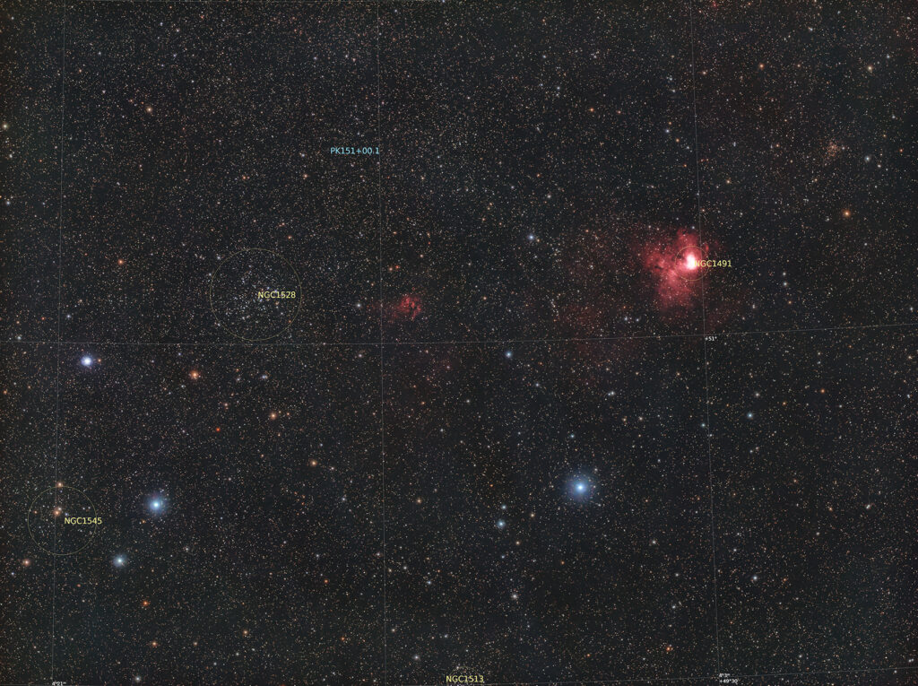NGC1528のすぐ西に位置するのが小型の散光星雲NGC1491で、水素ガスが放つ赤い光で輝いているが肉眼ではほとんど認められない。