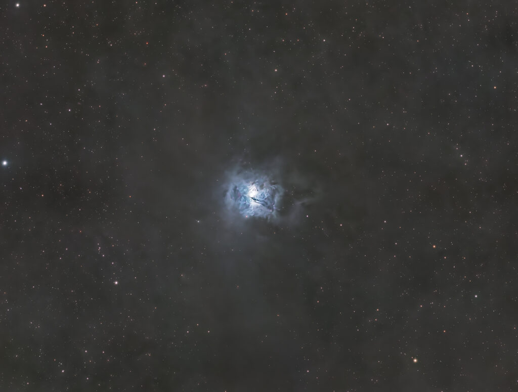 ケフェウス座にある散開星団NGC7023と重なり合った青白い散光星雲。