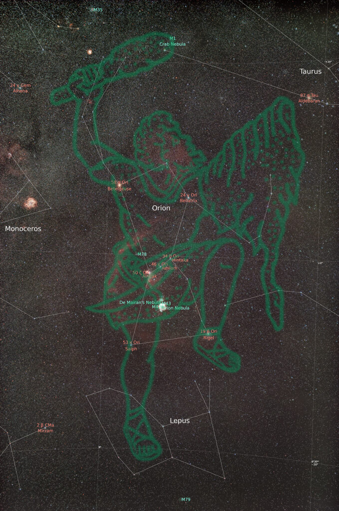 オリオン座は冬の夜空を代表する星座で全天88ある星座の中で最も形が整っており、ギリシア神話に登場する狩人オリオンがモデルとなっている。